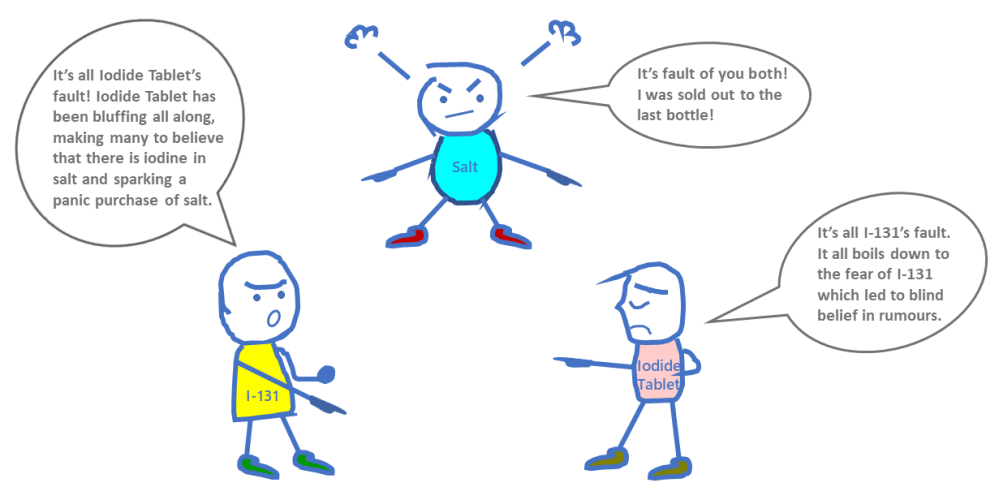 Radioactive iodine: “Perhaps people were worried about the radioactive iodide leaked from the nuclear power plant. Maybe they heard about the application of iodide tablet in nuclear emergency and mistakenly believed that all iodine-bearing substance is an antidote to radiation.”