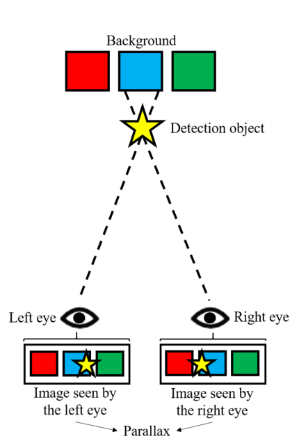 Figure 1 From the left eye’s viewpoint, the star appears to be on the right of the blue box; whereas from the right eye’s, the star appears to be on the left of the blue box. Such difference is referred to as parallax.