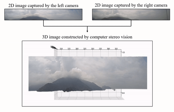 Weather observers usually infer the approximate height of cloud base by comparing it with reference landmarks with known heights. Although ceilometers can help, they are point measurements and thus the observations are very localized and not representative of the cloud base beyond the observing point. Besides, observers are not able to make observations all the time. Even if real-time weather photos are used, they are 2-dimensional and cannot provide important 3-dimentional information such as cloud base height. Cloud base height is extremely important for classifying cloud types, especially for identifying cloud types associated with high-impact weather (e.g. cumulonimbus clouds). Moreover, when the cloud base is very low, it may directly affect whether the pilot can see the runway of the airport. As such, cloud base height is very important to aviation safety. The Hong Kong Observatory has recently set up a number of high-resolution cameras at the Hong Kong International Airport with a view to automating cloud observations with the application of computer stereo vision technology. Preliminary trial shows that this technology can be used to construct the 3-dimensional image of the mountains and cumulonimbus clouds in the vicinity of the airport (Figure 3). However, development of this technique is still at an initial stage, and further research and evaluation are needed before it can be applied operationally in the future.
