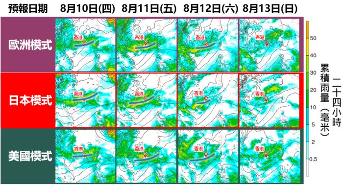 图一:电脑模式预测本周后期至下周初(8月10日至13日)晚上8时的天气图。各大电脑模式预测低压槽(蓝色线)会在星期四至星期六(8月10日至12日)为华南带来不稳定天气,有大骤雨及狂风雷暴。随著低压槽稍为减弱,下周初骤雨逐渐减少。