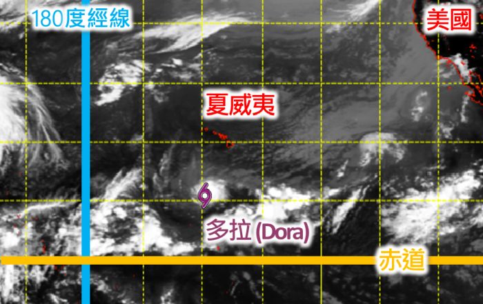图四:卫星图像显示现时位于夏威夷以南的四级飓风多拉(Dora)正逐渐向西移动,预料将在本周六(8月12日)跨越180度经线进入北太平洋西部。
