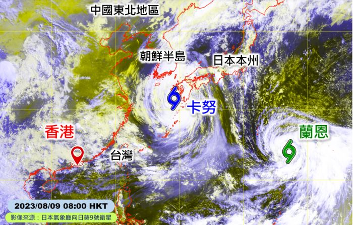 图二:卫星图片显示今日(8月9日)同在西北太平洋上的卡努和兰恩。