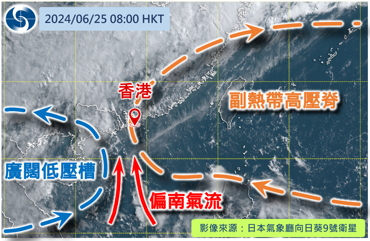 夏季时,香港会受到不同天气系统交替影响。在副热带高压脊或高空反气旋的主导下,天气会晴朗酷热。而偏南气流会把南海上暖湿的空气带到广东沿岸,令骤雨较常出现。在西南季候风或低压槽的影响下,大气条件会有利强对流天气的发展。不过天气系统往往不会单一地影响本港,它们相对的强弱程度及互相角力,让阳光骤雨天经常出现,甚至有雷暴同时发生。例如在今年6月25日,副热带高压脊复盖中国东南部,同时一道广阔低压槽影响广东西部沿岸,而它们之间的偏南气流正好为香港带来骤晴骤雨的天气(图二及图三)。