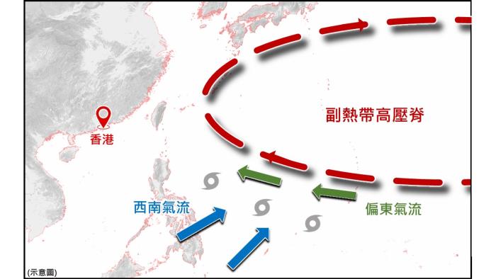 热带气旋偏少的主因是今年六至七月在偏大偏强的西北太平洋副热带高压脊影响下,热带西太平洋地区出现偏强下沉气流,不利对流发展及热带气旋生成。同时,由于跨赤道的西南气流亦较正常偏弱,降低了西北太平洋的水汽输送和辐合效应,亦是不利热带气旋形成的因素(图二)。