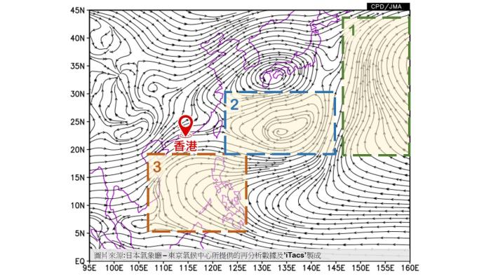 此外,由于八月南海一带大部分时间受反气旋流场所主导,抑制强对流天气发展,不利热带气旋在南海生成(图三 区域3)。直至八月二十九日,今年八月南海仍未出现热带气旋。根据过去统计资料,一九八五年、一九八八年、一九八九年和二零一四年的八月都曾经出现了南海「无风」的类似情况。