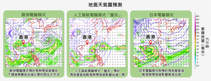 踏入九月,北方的大陆气流或季候风间中会南下,与潮湿温暖的越赤道气流于西北太平洋及南海汇聚。而各大电脑模式普遍预测一道广阔低压槽会在下周中后期影响西北太平洋至南海中北部,但对随后演变仍未有共识(图五)。
