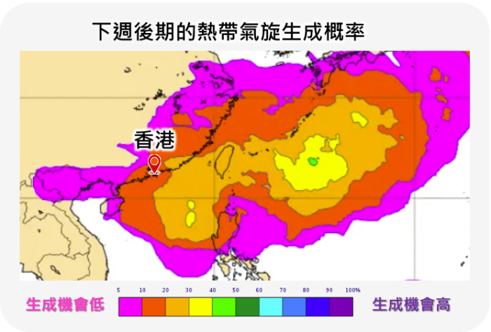总括来说,一道广阔低压槽会在下周中后期为西北太平洋至南海中北部带来不稳定天气,该区会否有热带气旋生成仍然存在颇大变数(图六),天文台会继续密切监测。此外,新学年将于下周展开,预料下周初广东地区风势微弱,天气酷热,但高温亦会触发骤雨。同学们请继续留意天文台最新的天气资讯。