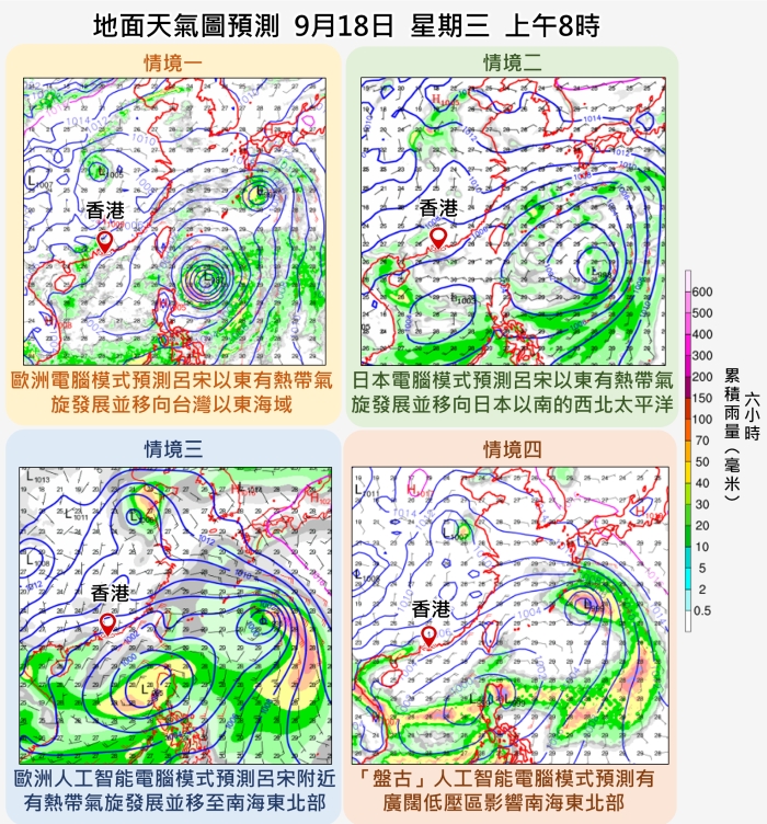 • 一道广阔低压槽会在下周初至中期为吕宋附近海域带来不稳定天气,而低压槽上可能有低压区发展,但各电脑模式对其随后发展存在分歧。天文台会继续密切监察。