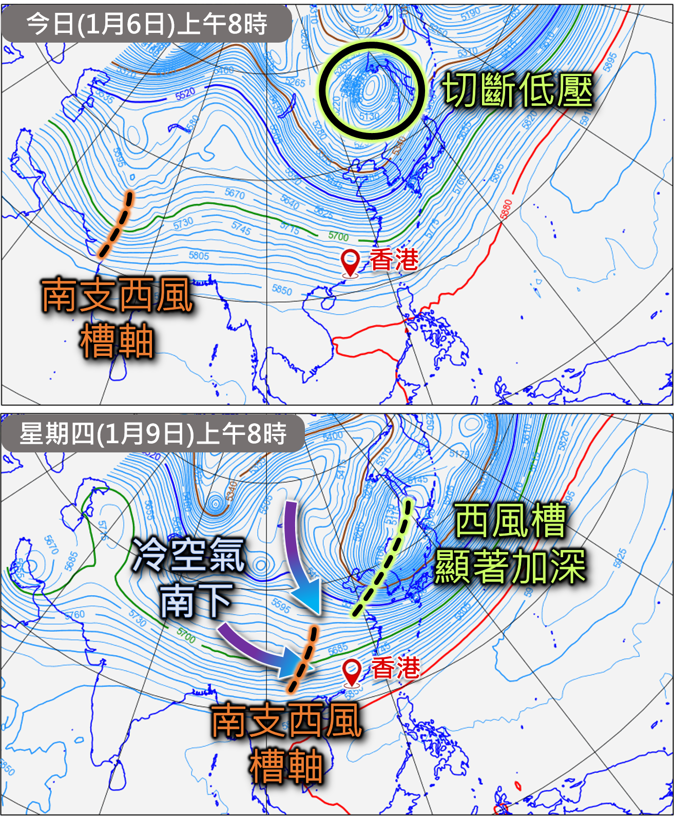 不过,这股冬季季候风为本港带来的跌温幅度仍有变数。当中包括与切断低压相关西风槽的演变、南支西风槽东移时的深浅、以及两者时间上的配合。若与切断低压相关的西风槽加深的位置较北或东移较快,或东移的南支西风槽较浅,冷空气向南推进的动力便会相对较弱,不利华南沿岸地区降温。
