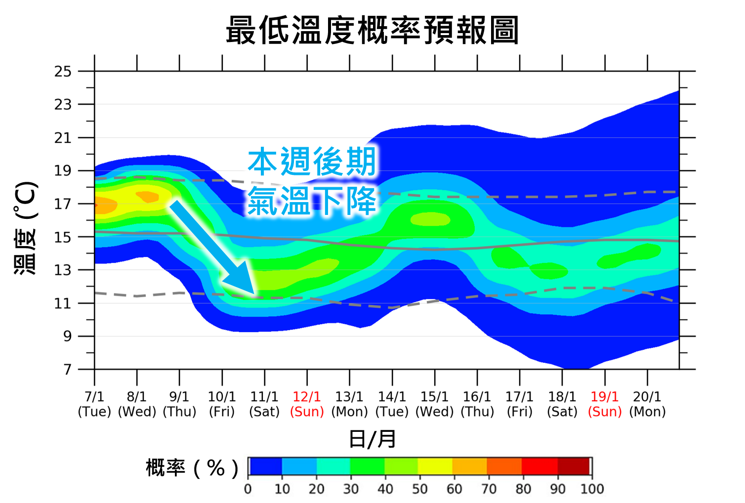 图二 最低温度概率预报图显示星期四气温开始下降,本周后期及周末期间天气寒冷。