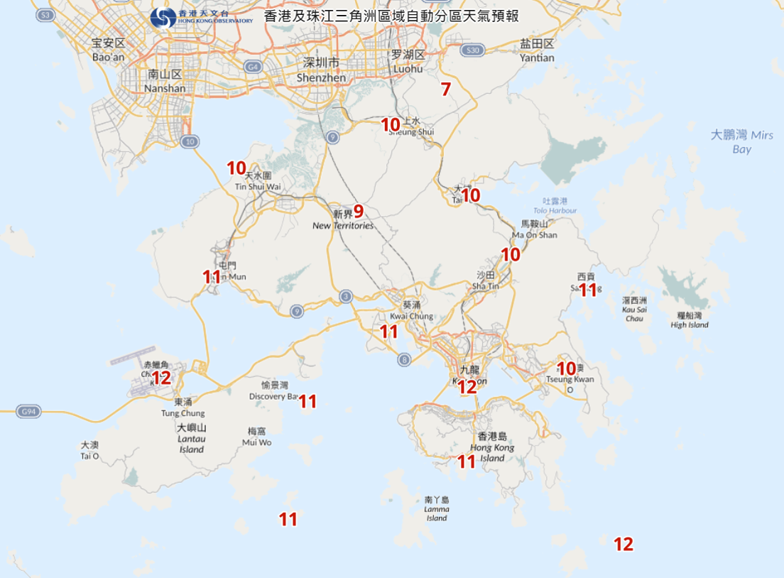 图三 自动分区天气预报(更新时间:1月6日中午)显示星期六(1月11日)上午7时本港天气寒冷,而新界北部部分地区气温更有机会达严寒水平。