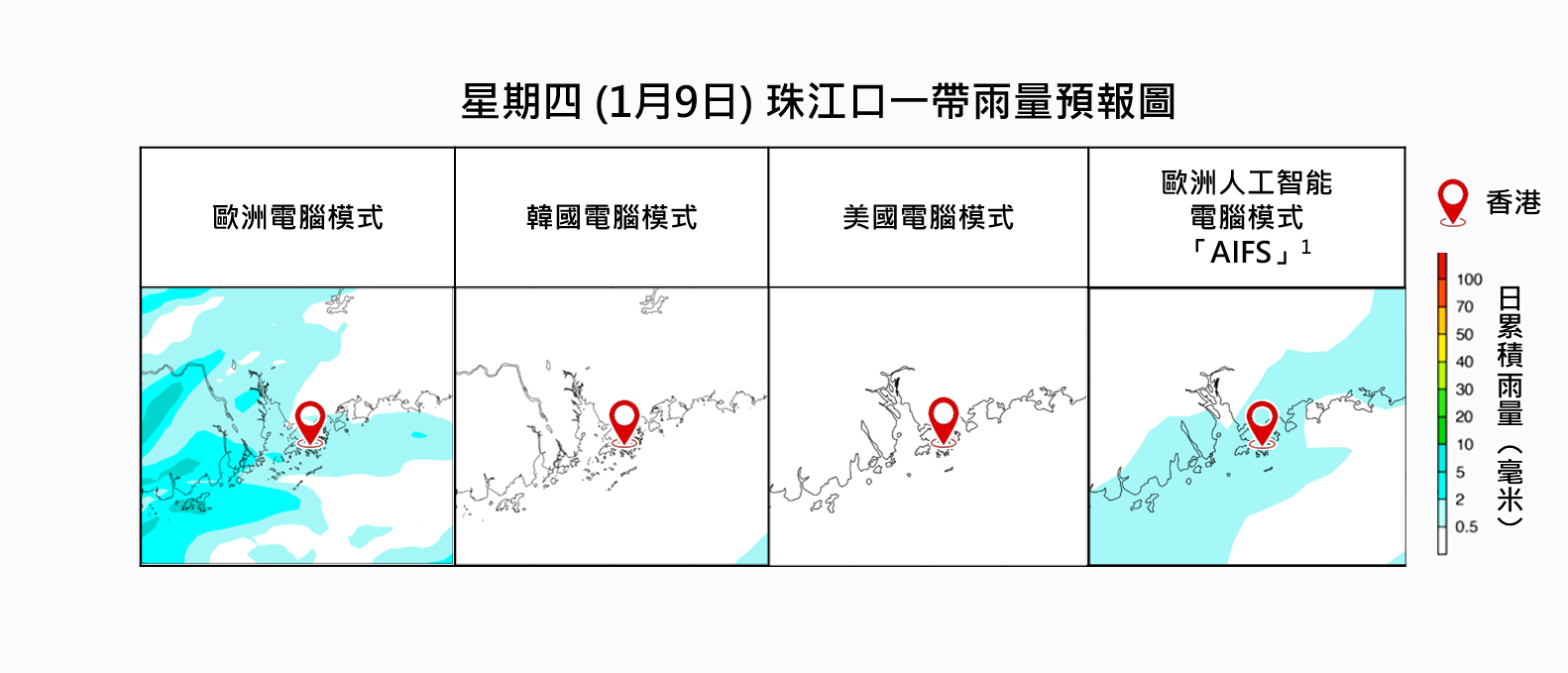 此外,冷空气南下时会否伴随降雨亦是影响温度跌幅的因素。显著的降雨会带来蒸发冷却效应,气温会有较大跌幅。不过目前电脑模式对珠江口一带的降雨预测仍然存在分歧(图四)。因此,周末前后香港天气到底会有几「寒」,仍需继续监测及评估。