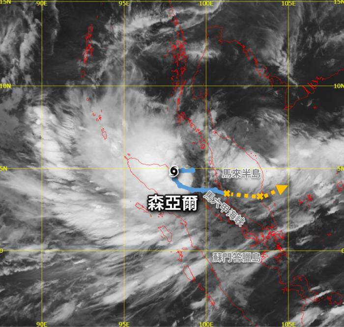 图一 香港时间11月26日上午8时左右的红外线卫星图像[3],当时森亚尔在马六甲海峡增强为气旋风暴。图中叠加森亚尔及其残余的暂定路径。