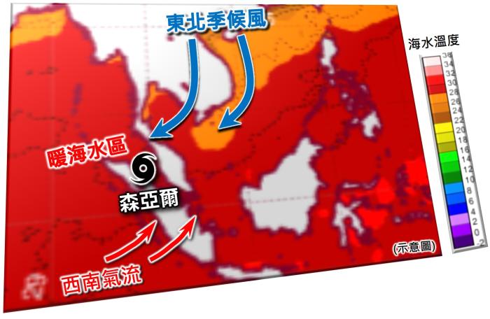 由于赤道附近的科氏力相当小,并不有利涡旋的产生,因此热带气旋较难在离赤道纬度5度或以内的地方形成[2]。但在今次特定气象条件下,东北季候风向南推进,扩展至赤道附近,与跨赤道的西南气流形成水平风切变,加上温暖的马六甲海峡洋面为对流提供能量,从而孕育出森亚尔这个罕见的「赤道气旋」。