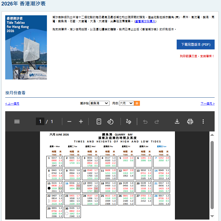 《2026年香港潮汐表》的完整版(PDF格式)现已上载到香港天文台网页,欢迎市民浏览及下载。「我的天文台」天气应用程式亦提供以图表形式显示香港潮汐资料。