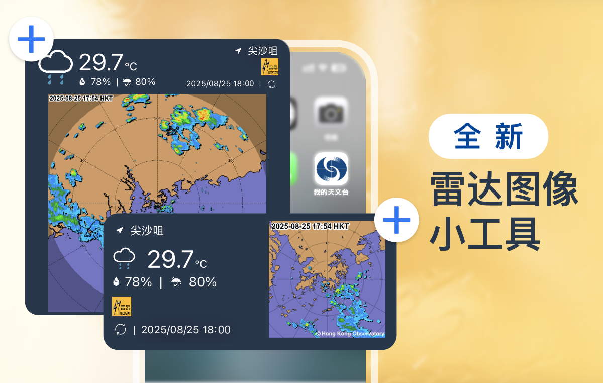 天文台于2025年9月12日推出「我的天文台」新版本(iOS版本7.13, Android版本5.16, 华为版本5.16),增设全新「雷达图像」小工具。用户只需要在手机主画面的页面上加入「我的天文台」雷达图像小工具,便可方便快捷地查看最新的雷达图像,天气资讯及天气警告等资讯,让市民更好掌握降雨情况。欢迎用户到以下连结下载「我的天文台」(iOS, Android, Huawei)并体验小工具功能。