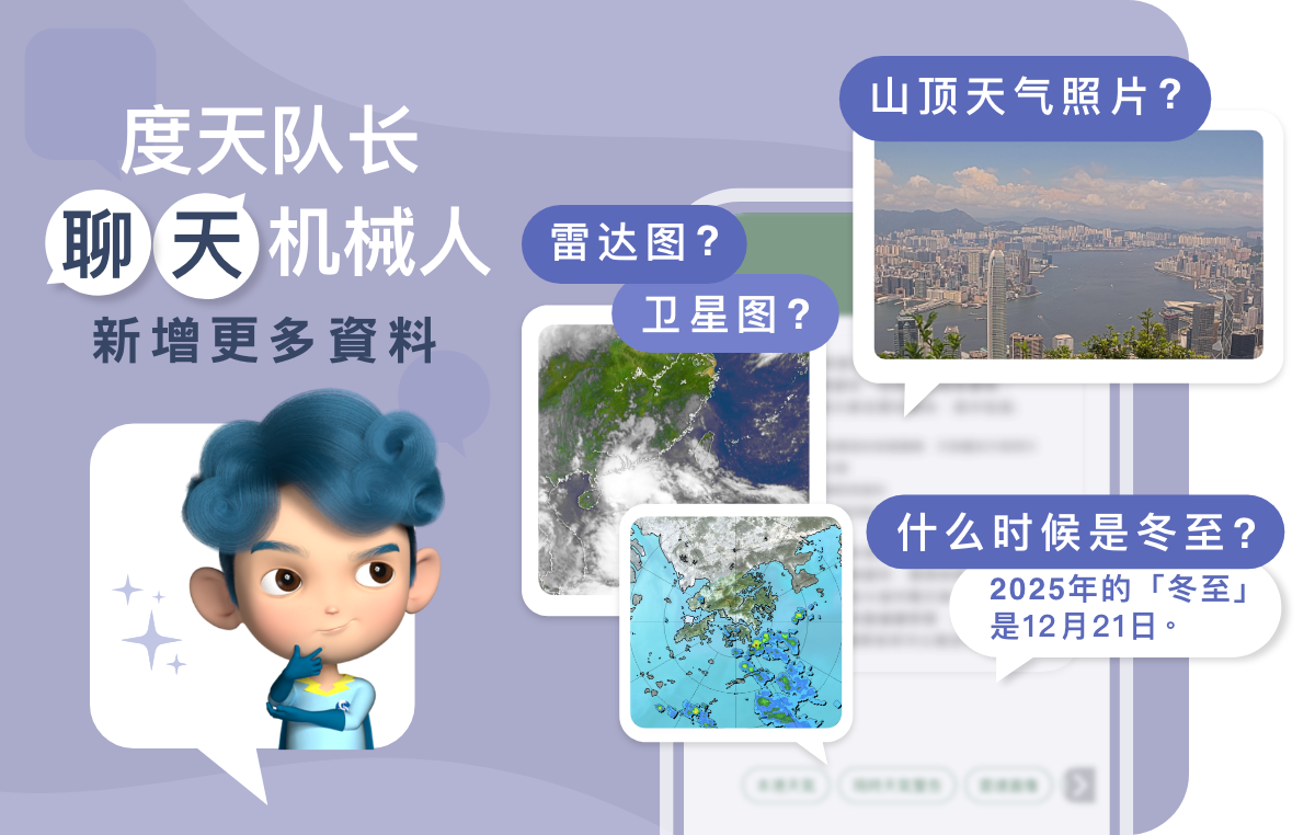 此外,「度天队长」聊天机械人亦加强了服务,新增协助用户寻找常用天气图像包括雷达图、卫星图、天气图、天气照片等,亦支援回答月食日食、廿四节气日期及公历农历对照等问题。用户只需要透过天文台网站首页或「我的天文台」与「度天队长」互动,便能获得各种天气及天文资讯。