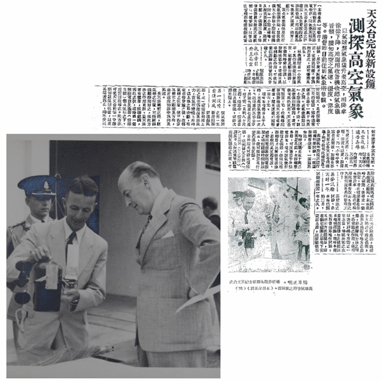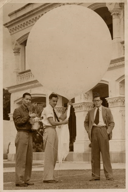 天文台常規高空氣象觀測始於1949年,最初地點並非京士柏,而是在尖沙咀的總部。當時天文台裝置了首套無線電探空系統,每日上午8時(夏令時則為上午9時)進行高空氣象觀測,涵蓋氣溫、濕度、風和氣壓。天文台同事以人手將掛上無線電探空儀的氣球注入氫氣及釋放(圖一),在氣球上升的過程中,無線電探空儀將測量到的高空氣溫、濕度及氣壓數據,用無線電波送回天文台總部地面站。至於測量高空風向風速方面,當時依靠天文台總部屋頂的一部經緯儀來追蹤氣球,從氣球的仰角及方位,以及升空的速度,來計算出不同高度的風向和風速。圖二的照片攝於1950年,當時天文台同事在總部屋頂利用經緯儀追蹤氣球,進行高空氣象觀測的試驗。由於這種方法全憑目視觀測,當遇上有低雲影響視野時,探空工作便無法進行。當時的高空探測氣球一般上升至大概20公里高才爆破,附著的降落傘會張開,無線電探空儀最後徐徐下降到地面或海面。