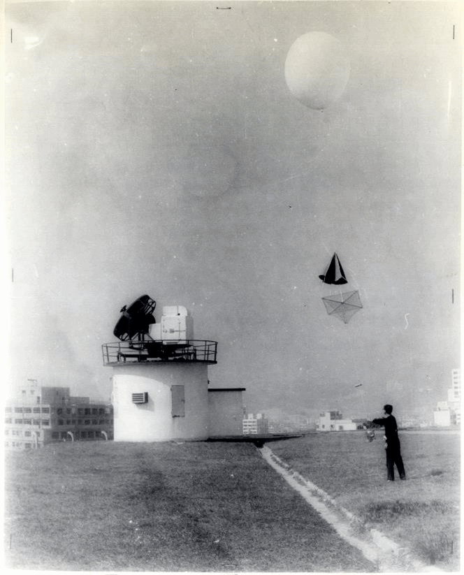 圖二 天文台同事於1950年在天文台總部屋頂進行高空氣象觀測的試驗。