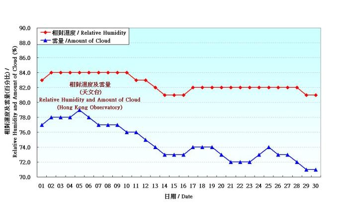 圖 3. 香港六月份相對濕度和雲量的日平均值(1961-1990)