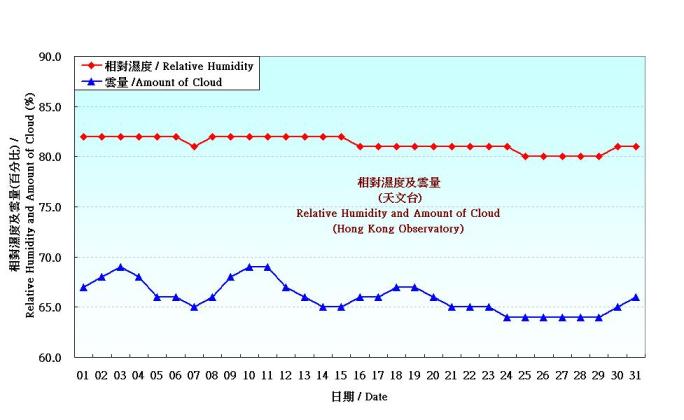 圖 3. 香港八月份相對濕度和雲量的日平均值(1961-1990)