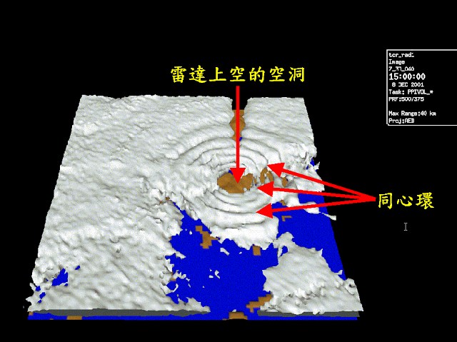 圖一 2001年12月8日下午3時的立體雷達圖像,這圖像只用大老山雷達數據製作而成。圖像顯示在大老山上空出現空洞和同心環。
