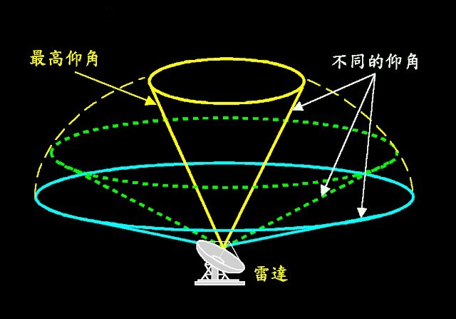 圖二 雷達以不同的仰角掃描大氣。