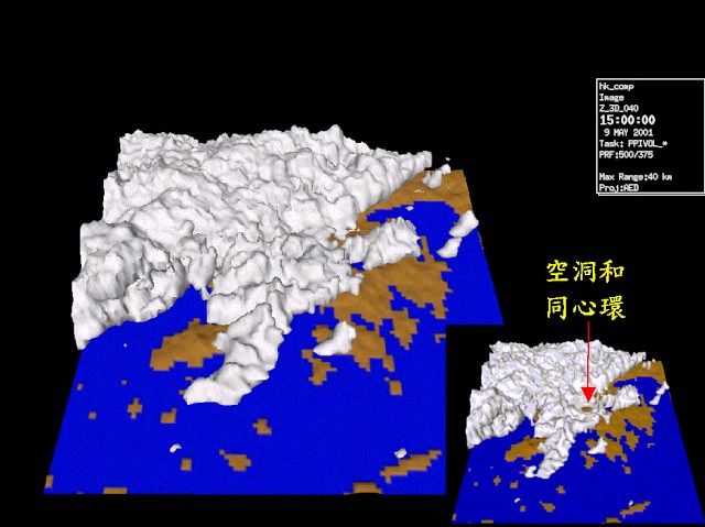圖四 2001年5月9日下午3時的立體雷達圖像,這圖像是結合大帽山和大老山天氣雷達資料製作而成。小圖是單獨利用大帽山雷達資料製成的圖像,突顯大帽山雷達上空出現的空洞和同心環。